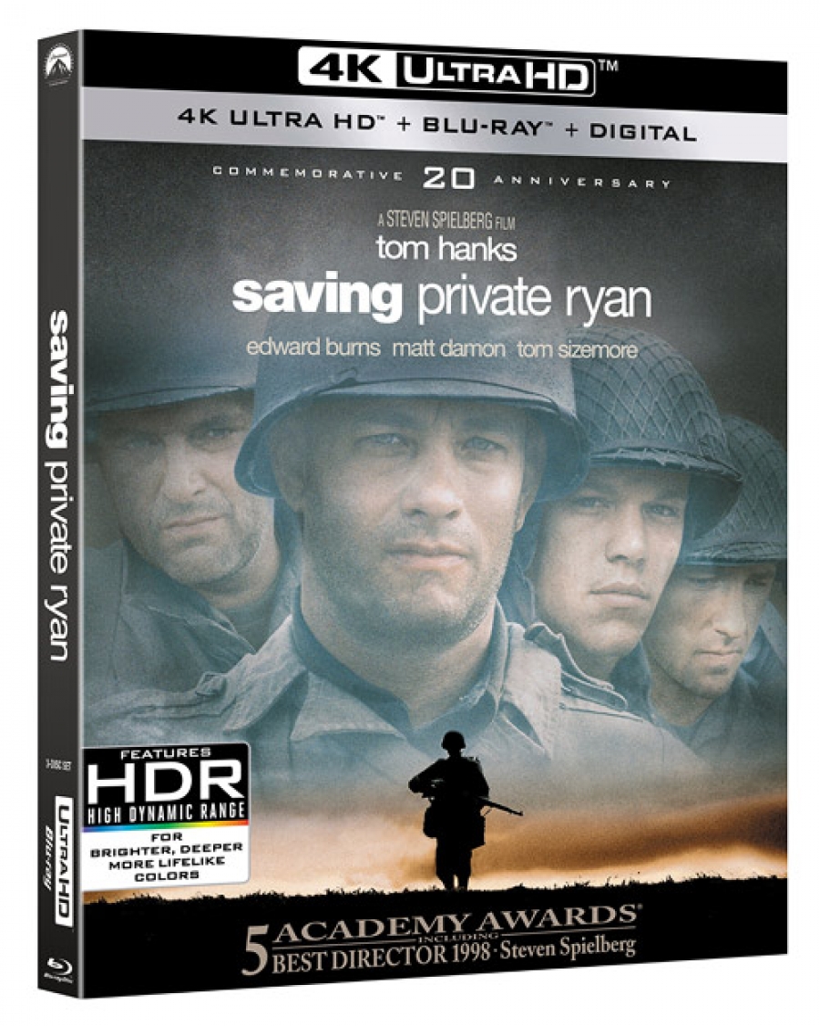 Now then, the big announcement news is more 4K Ultra HD: Paramount has just officially set Steven Spielberg’s Saving Private Ryan for release on 4K on 5/8 in a new 20th Anniversary Edition. The film has been scanned from 35mm film in full native 4K and will feature Dolby Atmos audio and Dolby Vision HDR. This is confirmed. The package will also include a Blu-ray edition with all the previous bonus features, as well as a Digital Copy code. You can see the official cover artwork above left and also below.